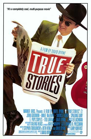 True Stories is a 1986 American film that spans the genres of musical, art, and comedy, directed by and starring David Byrne of the band Talking Heads. It co-stars John Goodman, Swoosie Kurtz, and Spalding Gray. Byrne has described the film as, "A project with songs based on true stories from tabloid newspapers. It's like 60 Minutes on acid."